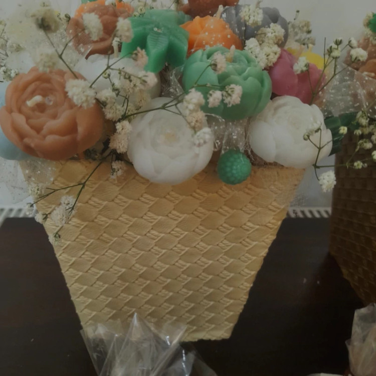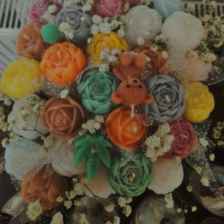 به غرفه مارگریت خوش اومدید باکس گل شمع شامل حدود 35 عدد شمع مختلفه و ابعاد بزرگی داره رنگ بندی و مدل گل ها سفارشی هست